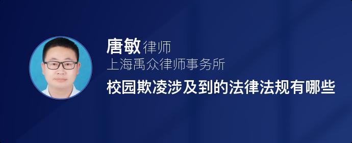 校园欺凌指在校园内外学生间一方(个体或群体)单次或多次蓄意或恶意通过肢体、语言及网络等手段实施欺负、侮辱,造成另一方(个体或群体)身体和心理伤害、财产损失或精神损害等的事件。校园欺凌涉及到的法律法规有《中华人民共和国治安管理处罚法》、《中华人民共和国刑法》、《中华人民共和国未成年人保护法》、《中华人民共和国民法总则》。